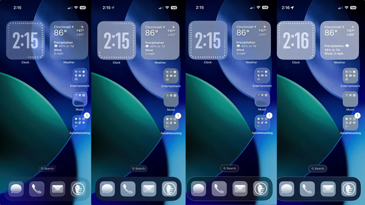 زجاج سائل بدون تعديلات (يسار)، زجاج سائل مع تفعيل تقليل الشفافية (وسط اليسار)، زجاج سائل مع تفعيل زيادة التباين (وسط اليمين)، وزجاج سائل مع تفعيل تقليل الشفافية وزيادة التباين (يمين).