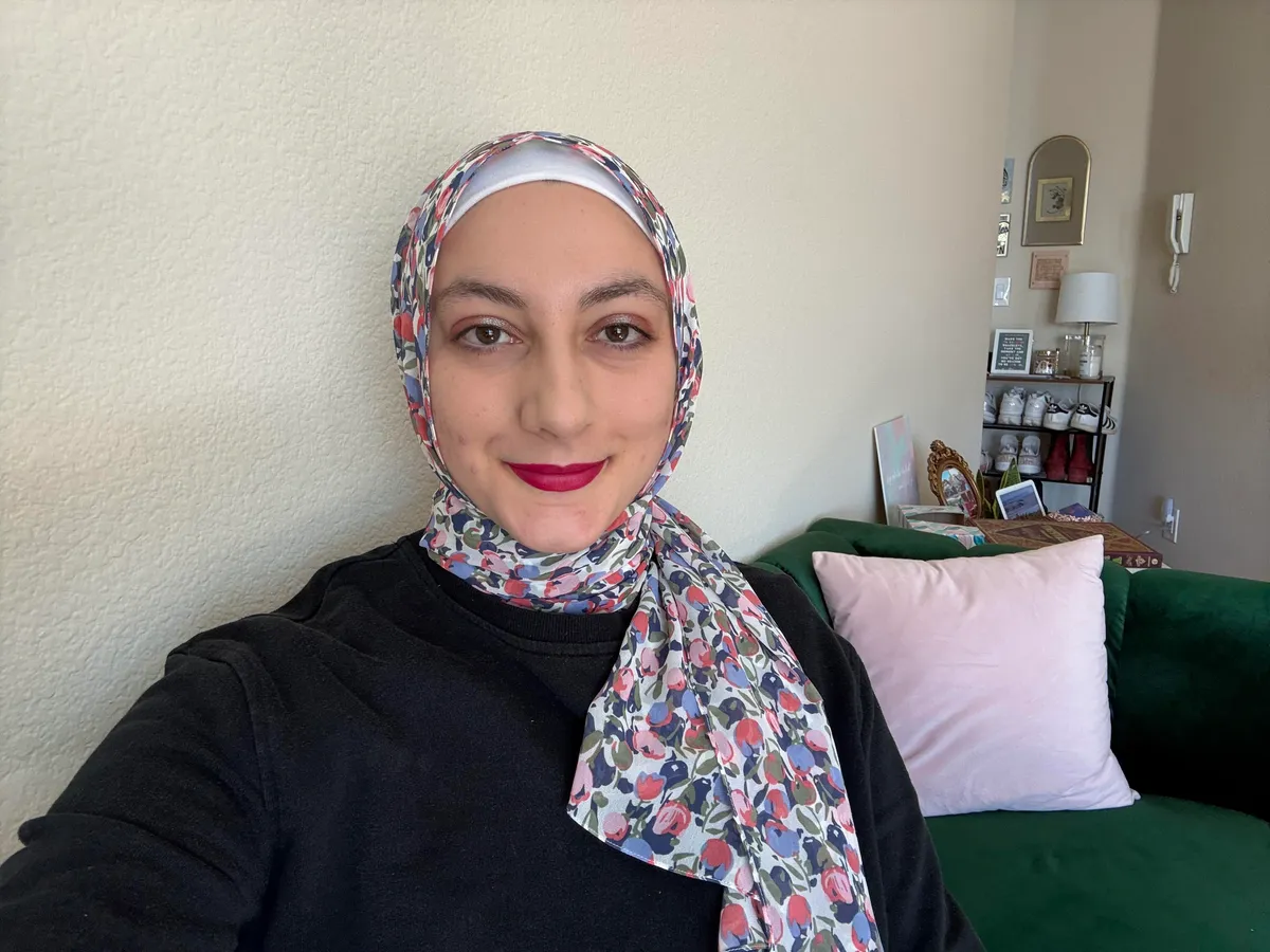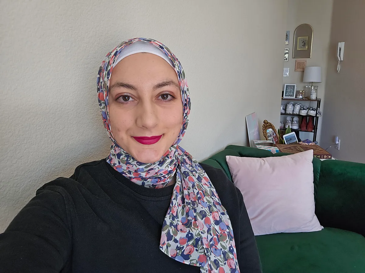بالانتقال إلى الكاميرات الأمامية، يكمن الاختلاف الأكبر في اللون، حيث يُضفي S24 Ultra إشراقًا على وجهي وقميصي الأسود، بينما يُظهر iPhone 16 Pro Max ألوانًا أعمق في جميع الأنحاء، من خضرة أريكتي إلى بشرتي. حتى الجدار خلفي يميل إلى البيج، على عكس اللون الرمادي الباهت في صورة S24 Ultra. كلتا الصورتين حادتان ومركزتان بشكل مُرضٍ.