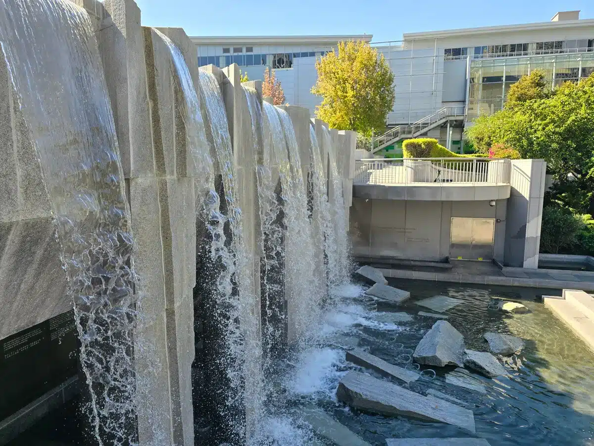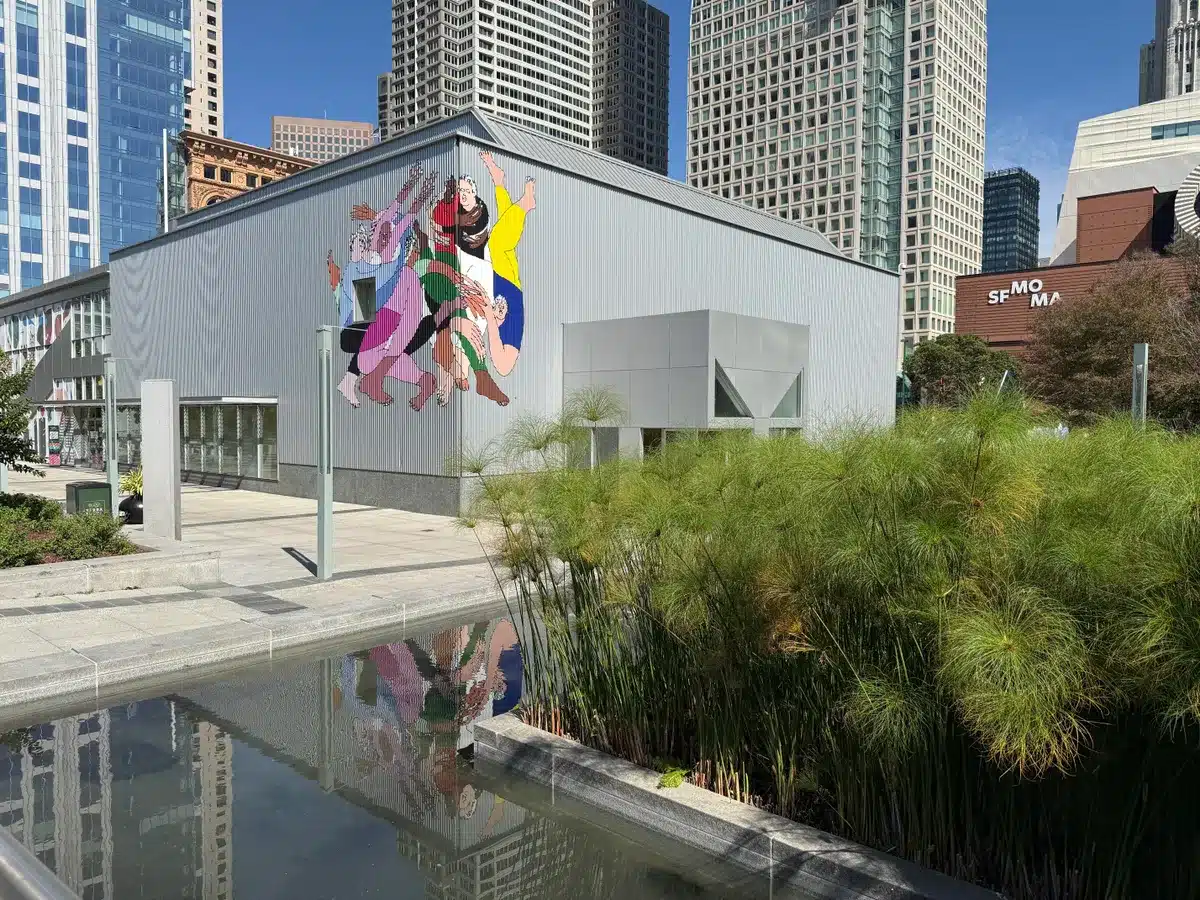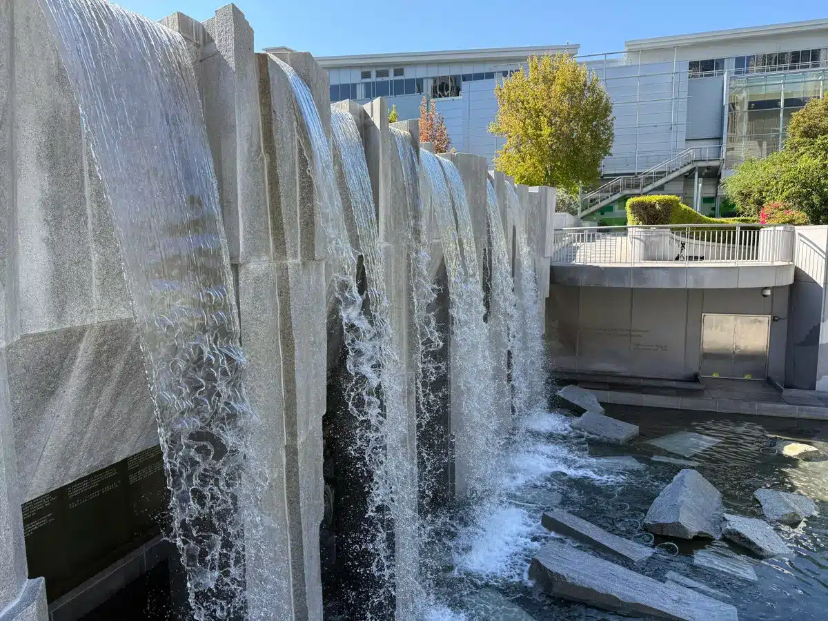 نزهة بعد الظهر في حدائق يربا بوينا في سان فرانسيسكو. لاحظ انعكاس الماء.